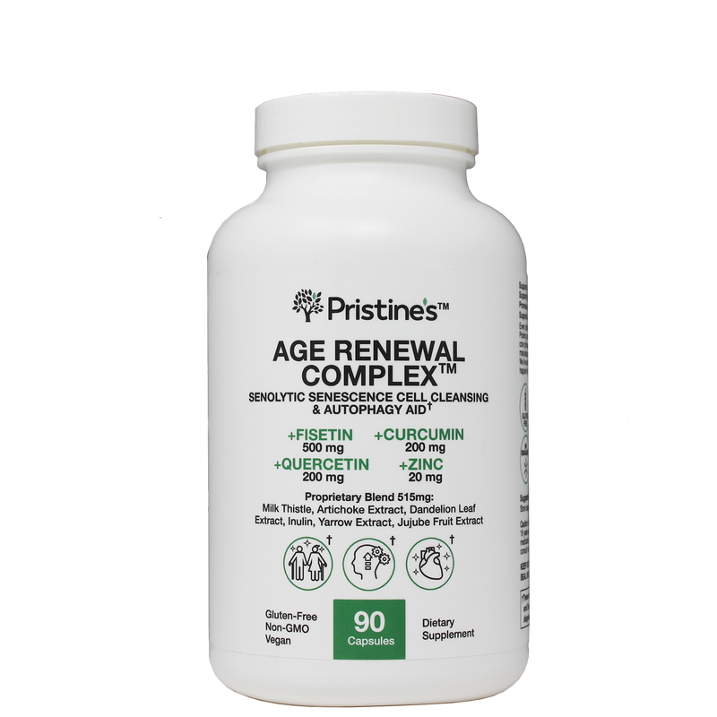Discover the power of PRISTINE'S Age Renewal Complex supplements—a carefully blended combination of fisetin, quercetin, curcumin, and zinc. Our unique formula supports rejuvenation, enhances your body's innate vitality, and combats signs of aging. Fisetin, a potent antioxidant, helps counteract harmful free radicals, while quercetin promotes a balanced immune response. Curcumin aids in detoxification. Zinc, a vital mineral, completes the formula to promote optimal bodily functions. Embrace a vibrant future with PRISTINE'S Age Renewal & Detox supplements and rediscover the energy and radiance of your youth. Try it today and experience your transformation firsthand!